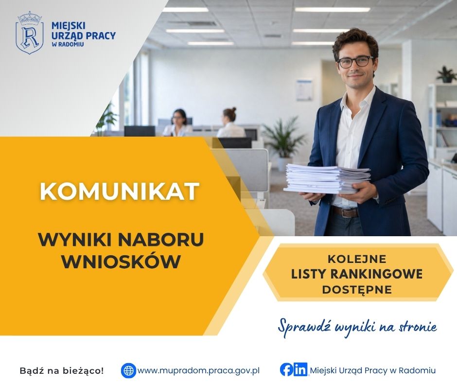 Aktualizacja – kolejne listy rankingowe Miejski Urząd Pracy w Radomiu publikuje kolejne listy rankingowe wniosków rozpatrzonych w ramach naboru na formy wsparcia...